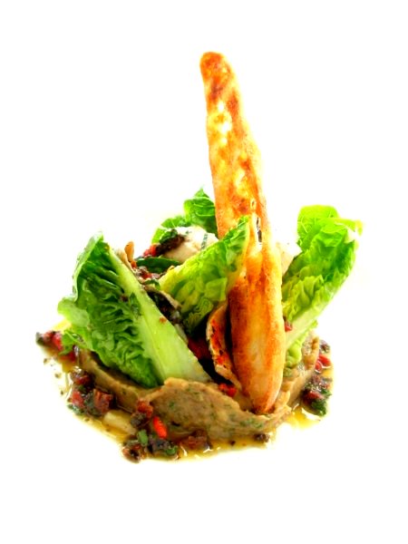 Caviar d'aubergines à la coriandre et cumin, anchois marinés et coeurs de sucrines, vinaigrette du sud