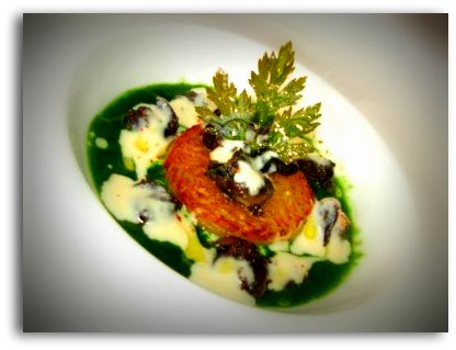 Oeuf de Poule Cuit en Verrine, Biscayenne et Emulsion de Petits pois, Mouillettes de Sobrassada