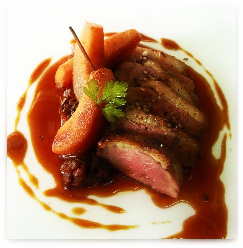 Magret de canard rôti, coings et compoté d'oignons rouge, jus Dolce Forte