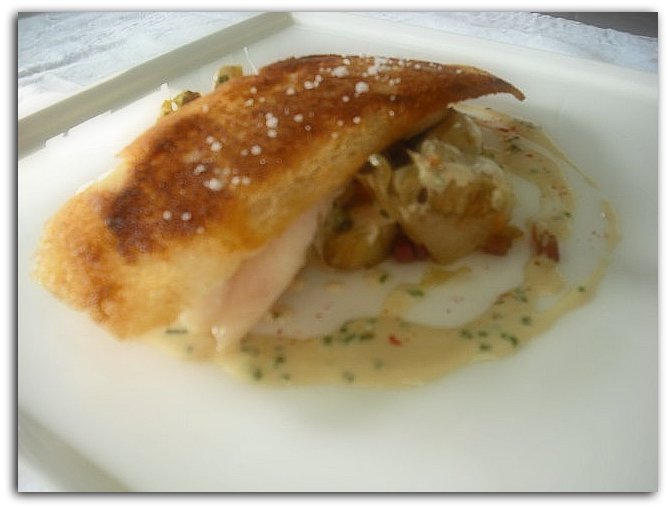 Filet de merlan en croute de pain, artichauts cuits à la Barigoule et coquillages