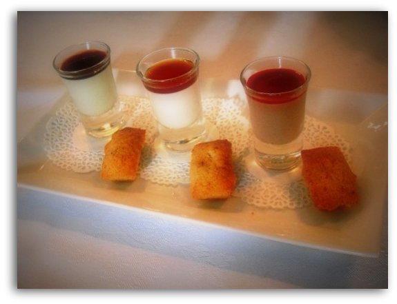 Trio de panna cotta, pistache-cerise, orange-caramel et cacao-framboise, financiers aux noisettes