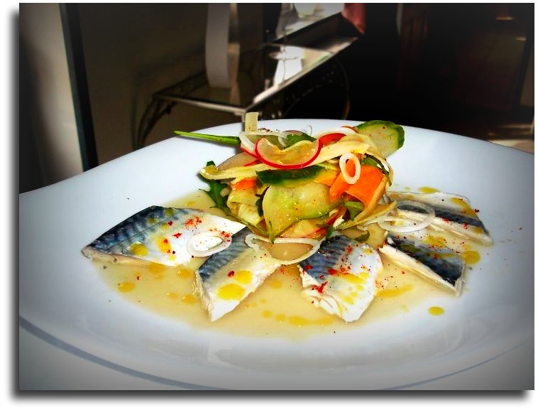 Lisette cuite en escabèche, salade de légumes croquants au pesto de roquette
