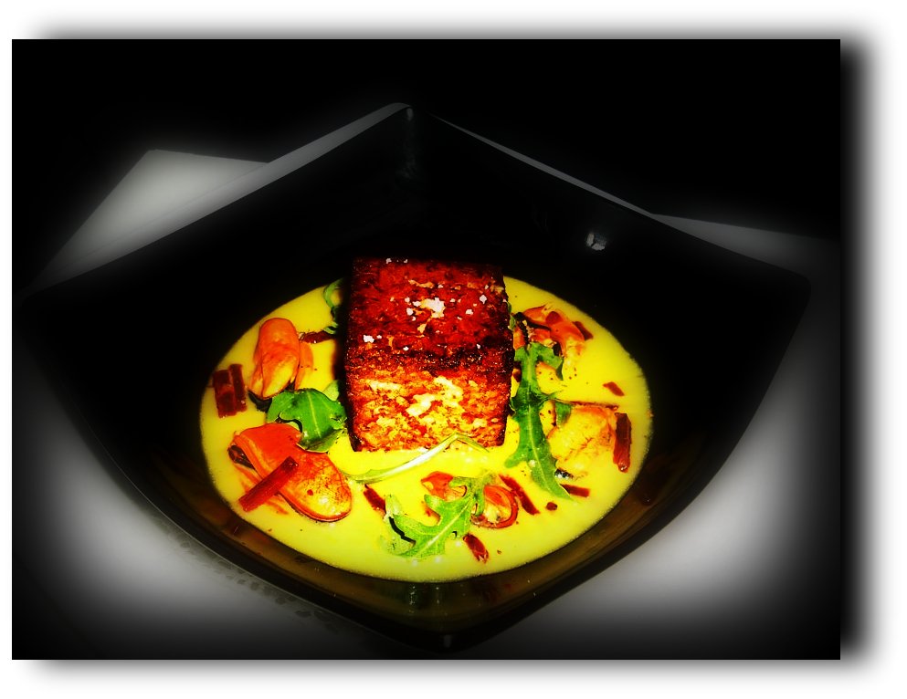 Risotto Al-salto au Piquillos, Coeur coulant au Safran, Moules d'Espagne et Chorizo Ibérique