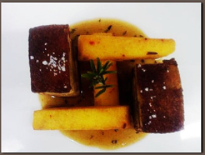 Poitrine de cochon fermier grillée à la plancha, frites de polenta aux piquillos, jus au romarin